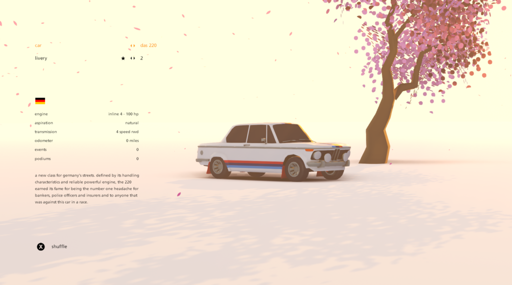 Cada vez que terminemos un rally iremos desbloqueando coches y diferentes liveries para estos, que podremos usar en el modo free roam. Este modo sirve para probar los diferentes autos que ofrece el juego en niveles que se abren por completo a nosotros. Podremos elegir el lugar, las condiciones, el auto y estamos listos. En este modo tendremos algunos coleccionables para agarrar, como las letras para completar la palabra RALLY, diferentes cassettes o fotos en los diferentes lugares del mapa.