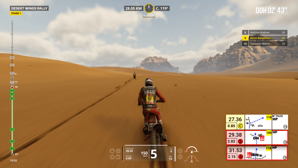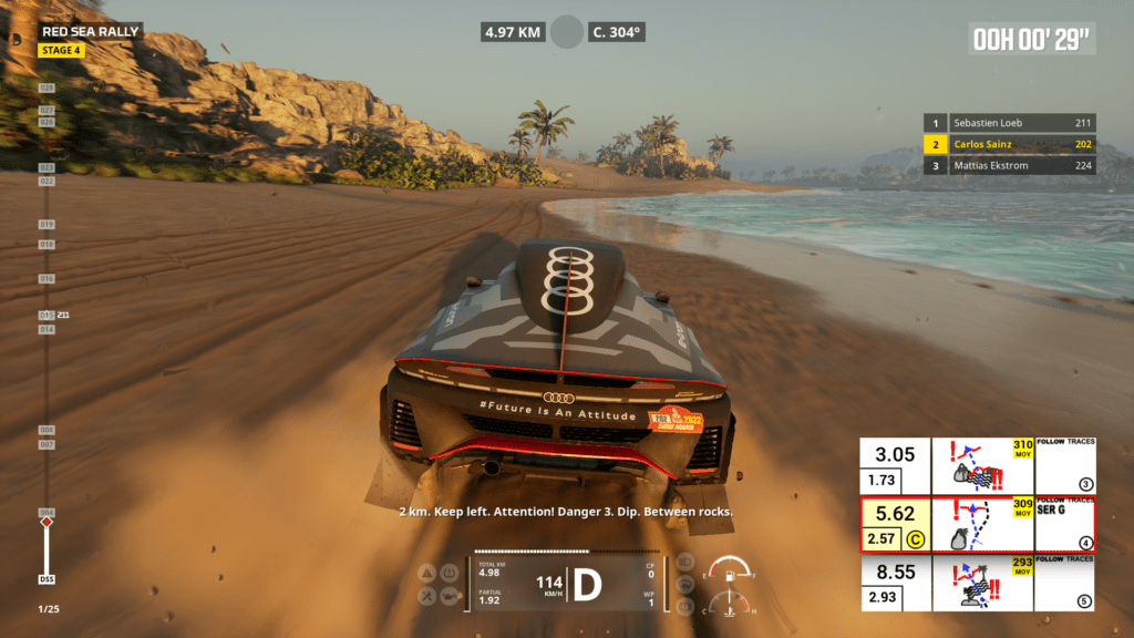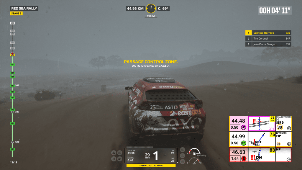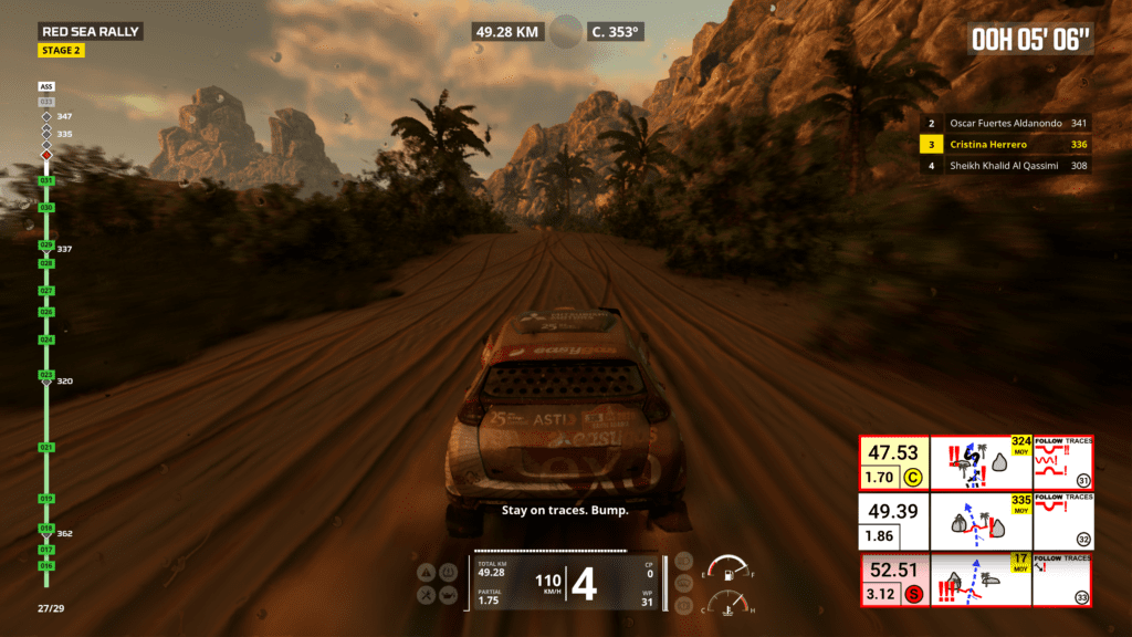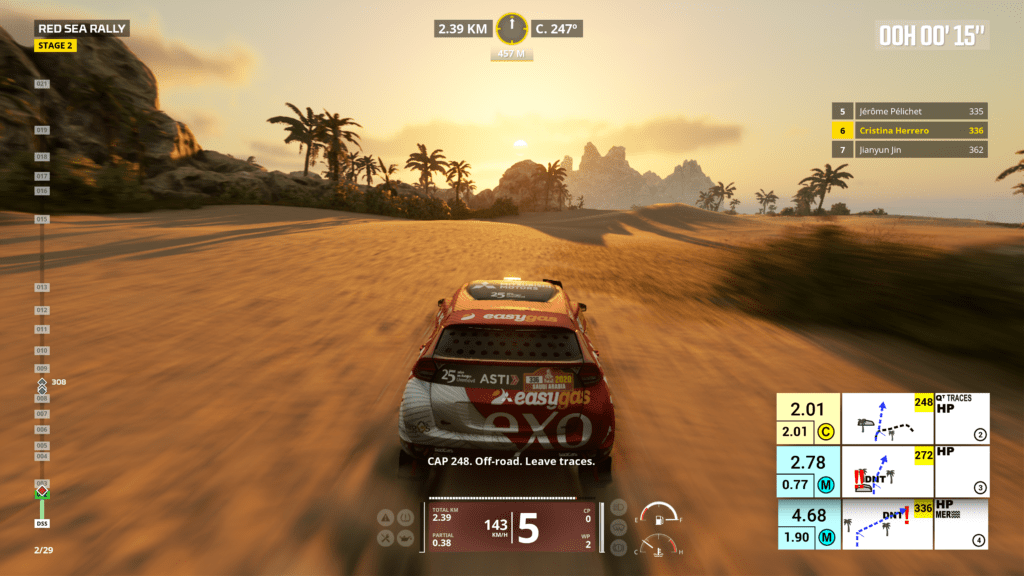 Ya que menciono el modo simulación, antes de meternos a las pruebas, podremos elegir diferentes modos de dificultad: el mas fácil con guías y waypoints que nos dicen a dónde ir, muy arcade; y otro un poco mas difícil y desarrollado, donde nos valemos del libro de ruta y, si tenemos, de nuestro copiloto. Los problemas se potencian cuando nos metemos de lleno en una etapa, porque las físicas y el sistema de manejo son bastante flojos, siendo los peores para manejar los quads. Casi todos los vehículos tienen un subviraje excesivo y siempre terminamos coleando y yéndonos a la mierda sin la posibilidad de corregir. Justo los únicos que sentí decentes para manejar fueron los camiones, bastante estables y no se iban a del camino al toque. Los problemas no se quedan ahí, ya que si tenemos copiloto, la vamos a pasar medio mal porque no solo nos dice las instrucciones tarde, sino que a veces directamente se saltea paginas de la hoja de ruta y terminamos yendo a cualquier lado, resultando en un ejercicio de paciencia y no tirar el control al carajo.