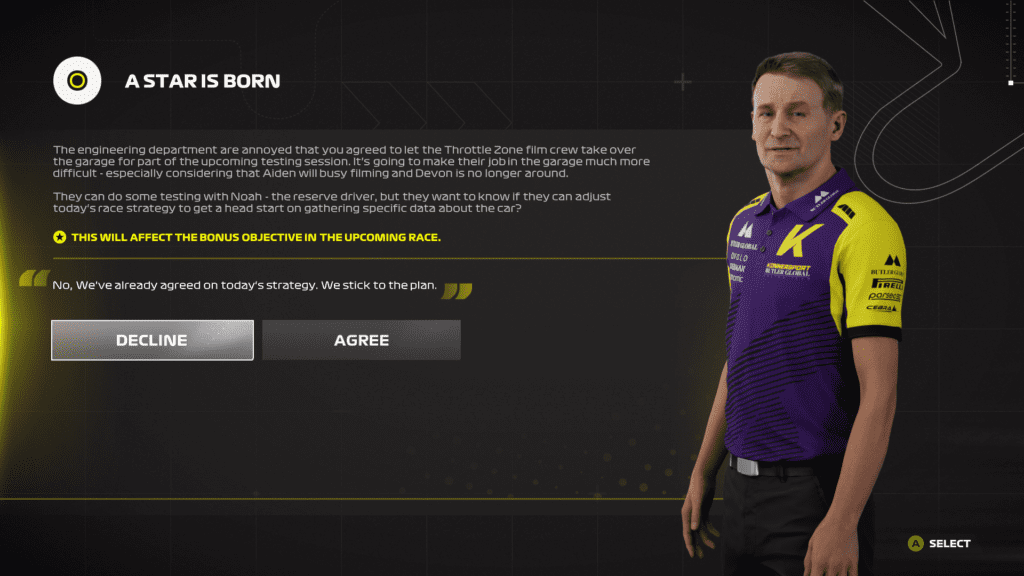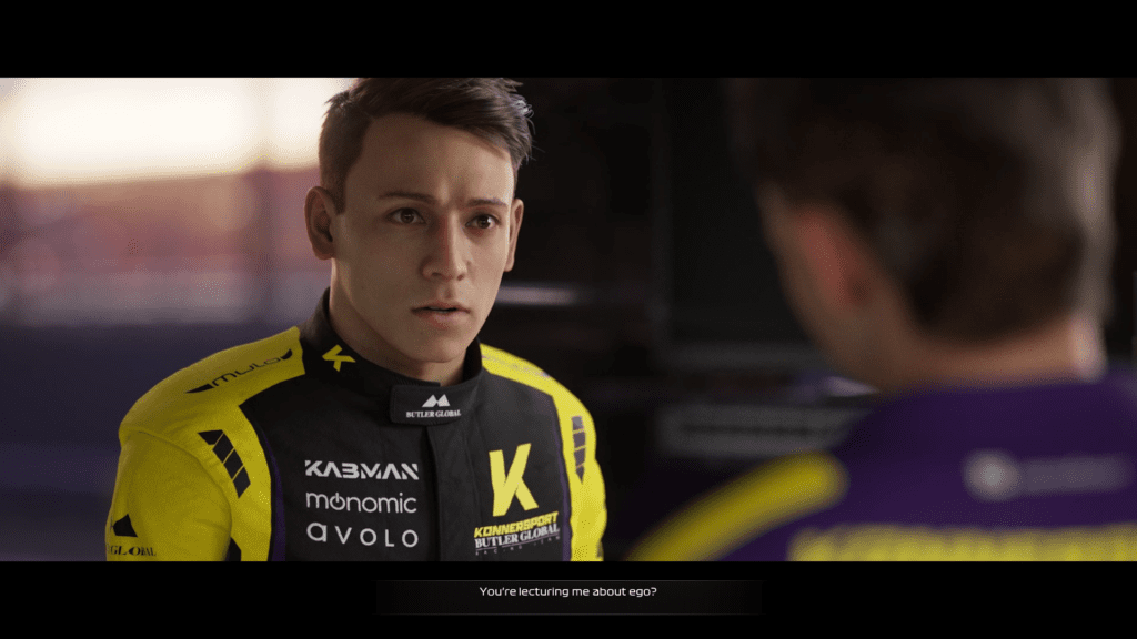 Ya desde el vamos, F1 23 nos ofrece una gran variedad de modos, y el primero del cual vamos a estar hablando es de Braking Point 2: ¿Se acuerdan de ese modo historia que vimos en F1 21? Esa breve historia llamada Braking Point nos llamó la atención a todos, teniendo todo ese drama y quilombos que parecían salidos de Drive To Survive, y en F1 23 esto lo llevan un paso más adelante. Acá seguimos una vez más la historia de nuestro querido Aiden Jackson, quien es ahora piloto de un nuevo equipo de la parrilla, Konnersport Racing Team, junto a nuestro archinémesis y el más panqueque de todos, Devon Butler. El ser parte de un nuevo equipo de la F1 es un cambio que está copado, ya que con esto se agregan cosas y se toman más libertades que vemos aplicadas en este nuevo modo historia. Primero, tenemos más drama en el equipo, ya que toman una dirección muchísimo más similar a la de Drive To Survive, con entrevistas a diferentes miembros del equipo, al Team Principal y demás, y obvio, más quilombos que vemos reflejados en pista. Segundo, vamos a estar tomando diferentes roles a lo largo de la historia, ya que iremos cambiando de perspectivas; a la vez, vamos a estar en el rol de team principal, donde tenemos que tomar decisiones que afectan a nuestro rating de performance y reputación, algo nuevo que se implementó en este Braking Point y que puede subir o bajar dependiendo de esas decisiones que tomemos y, si tenemos tal nivel de performance/reputacion, podemos tomar un camino u otro, a la vez que esto mismo lo podemos usar en las diferentes entrevistas post-carrera.