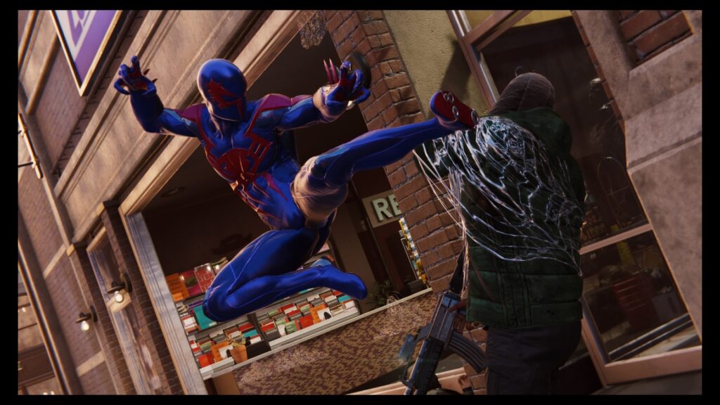 Otro aspecto que detrae a la larga es el repertorio limitado del combate cuerpo a cuerpo. Cuando venimos de jugar a los Batman Arkham, donde tenemos un millón y medio de combinaciones de golpes, tomar el Spider-Man y enfocarse exclusivamente en repartir bifes se siente muy monótono, sobre todo cuando nos topamos con bandas criminales dispuestas a cenar tus nudillos entre pan y pan. Por otro lado, para combatir esta limitación, Insomniac nos trae uno de sus aspectos más divertidos: los gadgets. Si bien al principio parece algo fuera de lugar, no está fuera de tono con el Spider-Man de los cómics, quien habitualmente recurre a inventos para zafar de sus enemigos. Narrativamente tiene sentido, ya que existe una razón por la cual usa estos gadgets (así como el look del traje tiene una razón narrativa de existir), pero para los que no están convencidos del todo de que Spidey use artefactos y cuanto chiche metan, tomen en cuenta que vive usando lanzarredes, rastreadores y tiene una linterna en el cinturón. Estos mismos gadgets nos sirven para aproximarnos a los enemigos desde un ángulo más agresivo (drones de ataque) o más sigiloso (trampas de red), lo que diversifica el estilo de combate, permitiendo al jugador adoptar su forma preferida sin perder el factor de diversión.