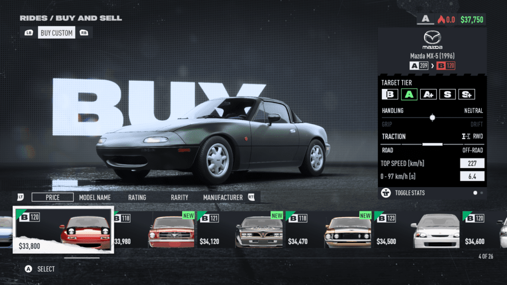 La lista de autos es muy extensa, teniendo alrededor de 150 para elegir y personalizar. Entre estos autos se encuentran marcas como Mazda, Mitsubishi, Ford, Subaru, Ferrari, BMW, Bugatti, Porsche y demás. También tenemos la posibilidad de comprar autos ya tuneados, que salen caros pero son muy rápidos. Cada auto tiene su respectiva clase que irá cambiando a medida que lo vayamos personalizando.
