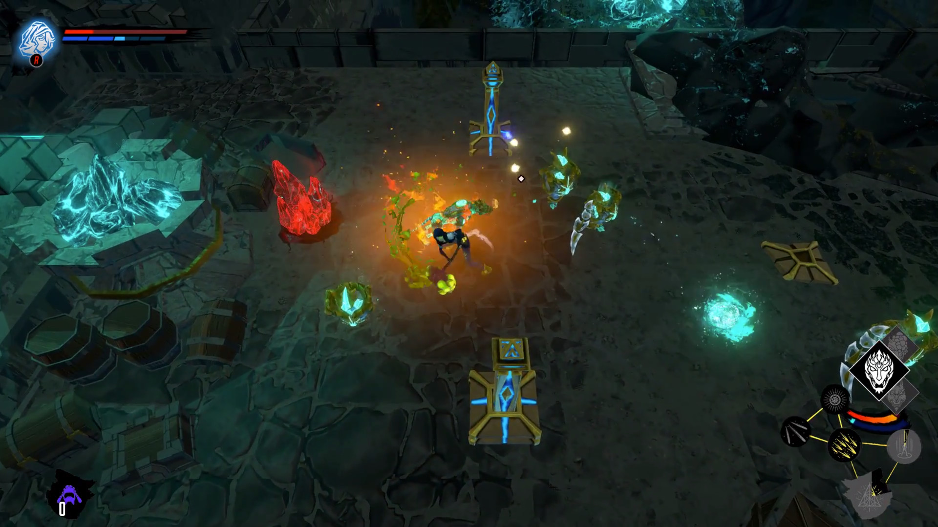 Mis dos únicos problemas a nivel técnico que encontré fue primero un descenso de FPS al momento de reventar cristales (ítems que recuperan la vida o la barra de energía). Supongo que es por el efecto de partículas que no debe estar bien optimizado (y también tomando en cuenta que lo jugué en el primer modelo de PlayStation 4). También presencié esto de a momentos cuando aparecían muchos enemigos en pantalla (no siempre, cabe mencionar) entorpeciendo la jugabilidad. El otro fue un lock en la dirección de los proyectiles, el cual se apunta con el analógico. Encontré por momentos que la dirección se trababa sin ninguna razón en particular (no había enemigos ni mi joystick andaba mal), a pesar de estar apuntando para otro lado seguía disparando para aquella dirección.