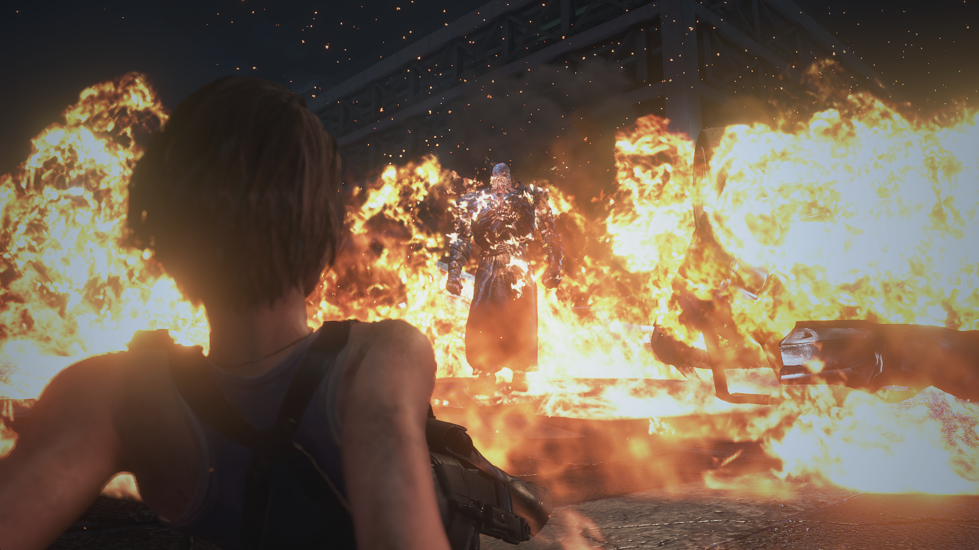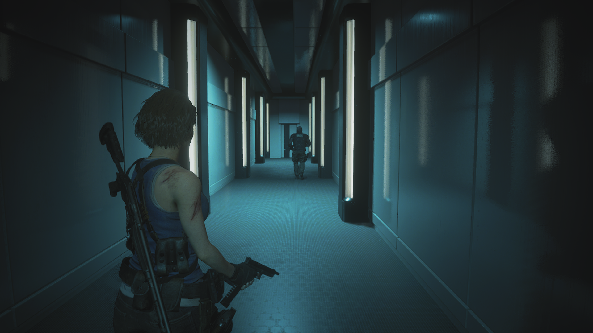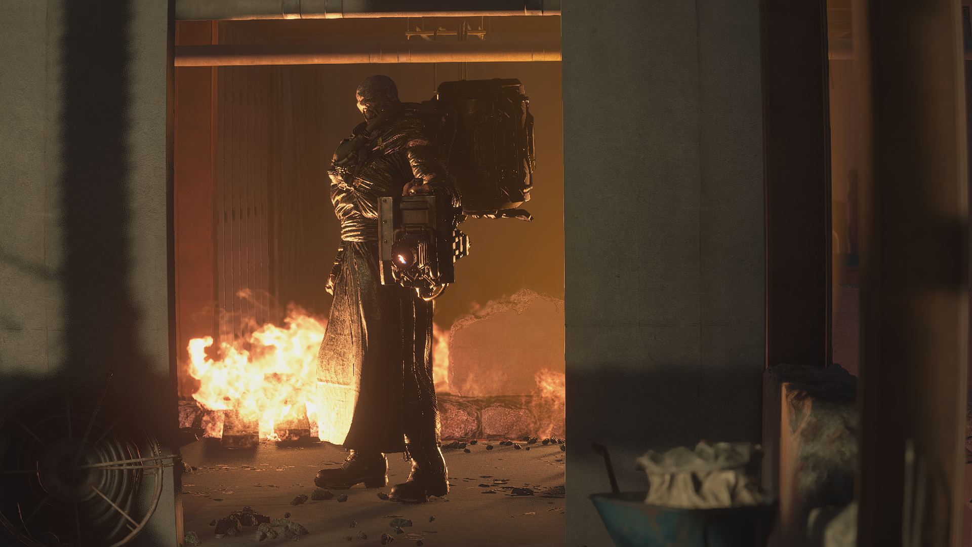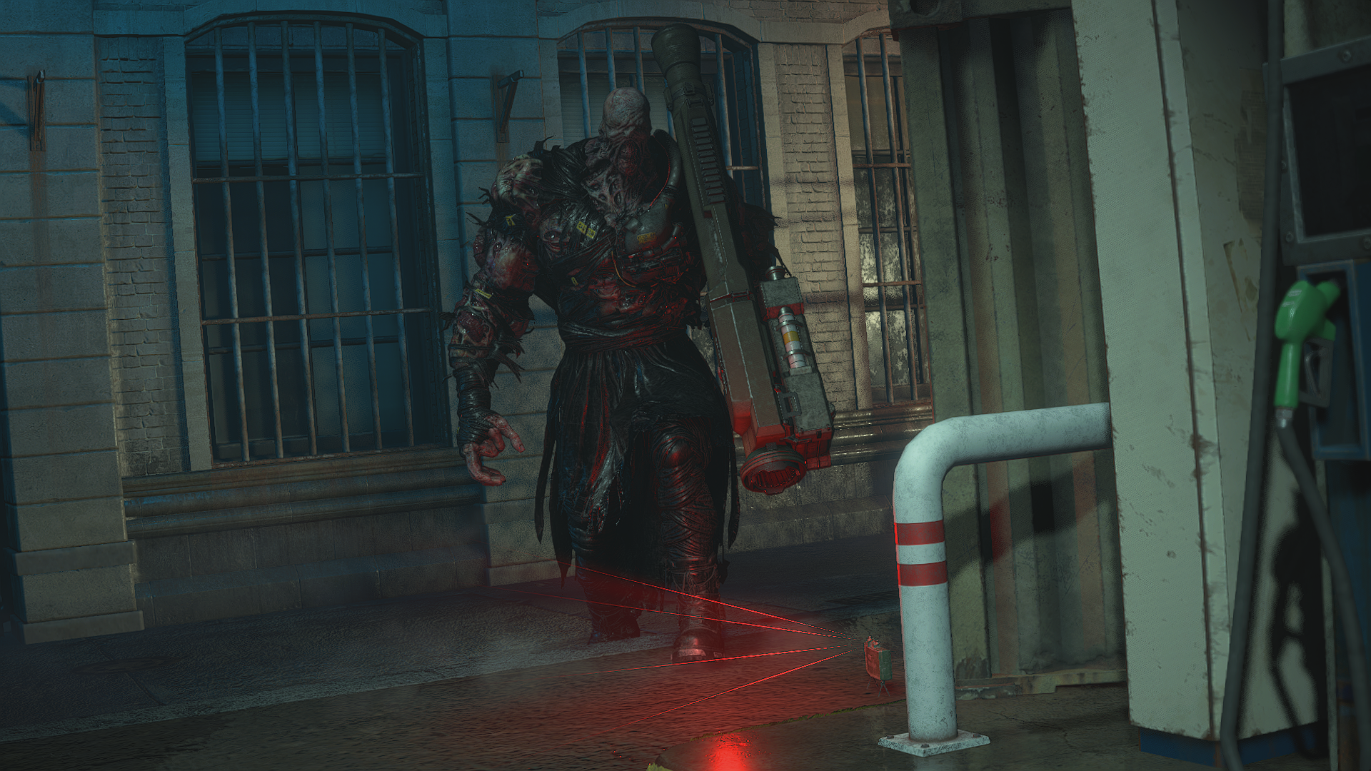 Si en el original te daba miedo, acá va a ser aterrador. El rediseño de Nemesis realmente es acertadísimo, ya que es extremadamente amenazante y cuando lo tenemos en frente, la alternativa es correr (a excepción de que estemos bien armados y queramos alguna pieza extra para nuestras armas si lo tumbamos). No solo eso, sino que usa sus tentáculos para atraernos si nos estamos escapando, da un salto hasta donde estamos para atacarnos, o inclusive más adelante nos ataca con armas como un lanzamisiles como el original o un lanzallamas. Justamente como en 1999, estos momentos están scripteados, y no son como Mr. X donde literalmente nos persigue por todos lados. Si conseguimos escapar de él y pasamos a otro lado, no nos va a perseguir más, pero si lo perdemos de vista en la misma sección, nos sorprenderá de golpe y nos seguirá persiguiendo.