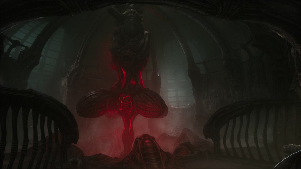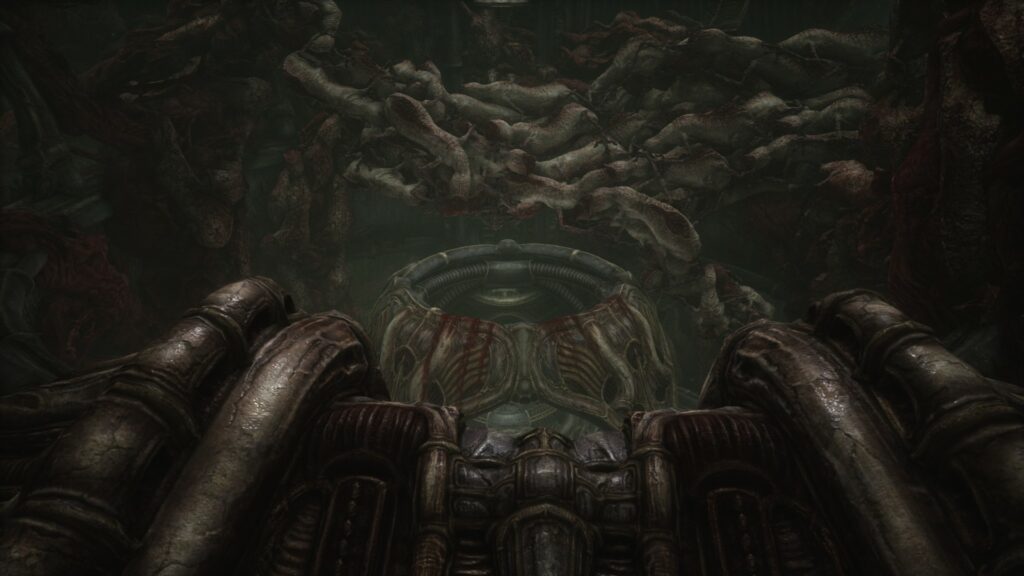 Ahora bien, que el fichín sea de resolver acertijos con poca indicación no tiene por qué se un problema: ya vimos que a The Witness no le fue tan mal. El problema es cuando no tenemos referencia de nada y todo se ve igual. Por ahí suena exagerado, pero es muy fácil perder el sentido de la orientación a causa de la dirección artística y cómo se repiten patrones, una clara inspiración en H. R. Giger (diseñador de los monstruos de la película Alien, de la base del micrófono de Jonathan Davis y artista del horror maquinorgánico), quien a la fecha de escribir esta review, según Wikipedia aparece como “participante” en el desarrollo del juego. Medio raro siendo que falleció en 2014. Gracias a su legado tenemos escenarios complejos con vistas impresionantes, y lo que se siente como “zonas designadas” para apreciarlos, cosa que suma a la confusión ya que se bifurcan del camino que podemos tomar y no tienen interacción.