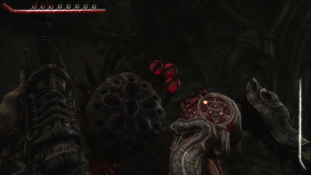 A estos bichos desagradables se les suma el entorno y nuestro propio personaje, una especie de humanoide sufriendo la absorción de este mundo de pesadilla en forma de las animaciones de las que vamos a ser testigo y que, quiero destacar, están muy bien pulidas. Es bastante impresionante ver cómo un parásito con brazos se acopla a nuestro cuerpo y guarda y sostiene nuestros ítems en nuestra propia panza perforada. Un deleite visual para los raritos.
